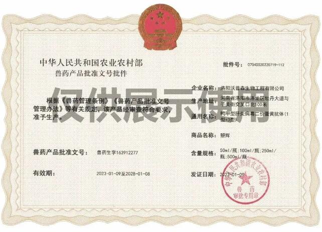根據(jù)《獸藥管理?xiàng)l例》和《獸藥產(chǎn)品批準(zhǔn)文號管理辦法》的規(guī)定,經(jīng)農(nóng)業(yè)農(nóng)村部審查,準(zhǔn)予洛陽沃普森生物工程有限公司(以下簡稱“沃普森”)生產(chǎn)治療性生物制品相關(guān)產(chǎn)品,并核發(fā)獸藥產(chǎn)品批準(zhǔn)文號。