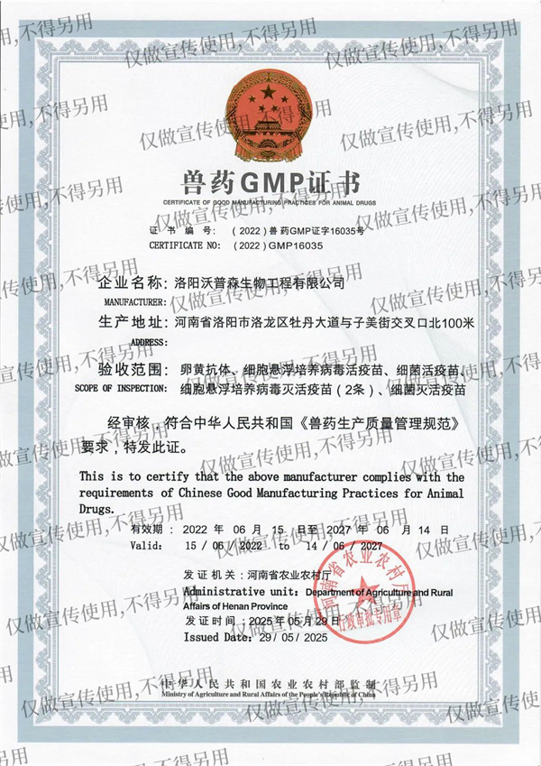 近日,受河南省農(nóng)業(yè)農(nóng)村廳邀請,農(nóng)業(yè)農(nóng)村部獸藥GMP檢查組專家對洛陽沃普森生物工程有限公司(以下簡稱“沃普森”)動物疫苗生產(chǎn)車間(含三級防護生產(chǎn)線)進行獸藥GMP現(xiàn)場檢查驗收。